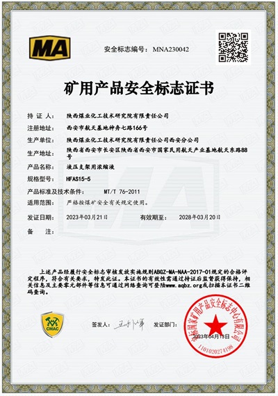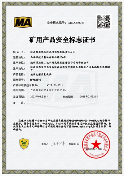 近日,由研究院自主开发的液压支架用浓缩液、液压支架用乳化油等四款产品取得了国家安标中心颁发的矿用产品安全标志证书。这标志着液压支架系列产品的产品质量满足国家要求,具备向各矿业公司销售的资格,也标志着液压支架系列产品的市场推广工作迈出了重要一步。